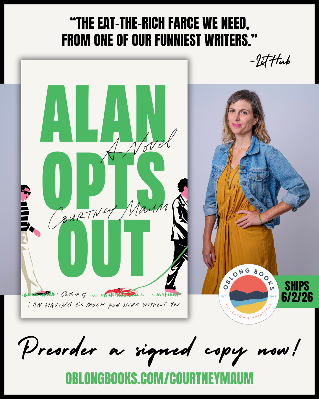 This development is anathema to his wife, Vivian. She’s just a few positive affirmations, a swimming pool, and a series of social tests away from finally becoming a part of an elite women’s club in their adopted town of Greenwich, Connecticut. While contending with a daughter who wants to write plays and another who has an unnatural empathy with animals, she can only watch as Alan moves into their backyard playhouse to live off the land and—worse—spend time with the family. But instead of shocking the neighbors, Alan’s commitment to a less-is-more lifestyle seems to be catching on. Could everyone want what Alan’s not selling? coming June 2, 2026 from Little Brown and available for purchase now. You can get a signed copy and a lobster sticker via Oblong Books
